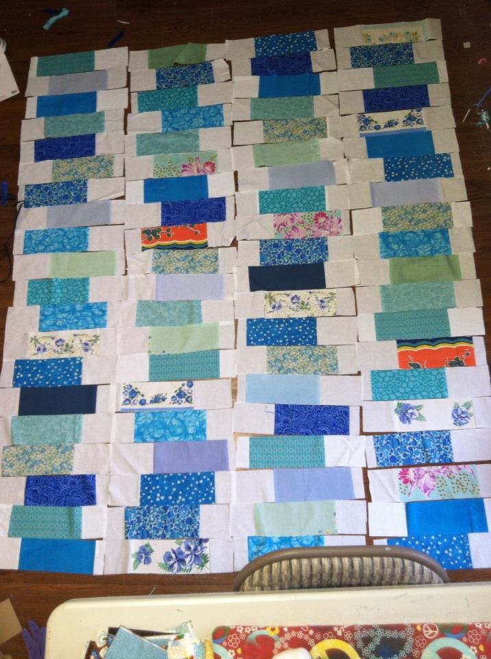 I would change it up a bit, though. My idea would be to cut the orange in half and insert more of the smaller pieces here and there throughout the quilt. I would make it an odd number of pieces too, with 3 the minimum. I think having just 2 large pieces the same size as the blue pieces makes the orange too flamboyant. Think accent color, which needs to be a bit smaller.