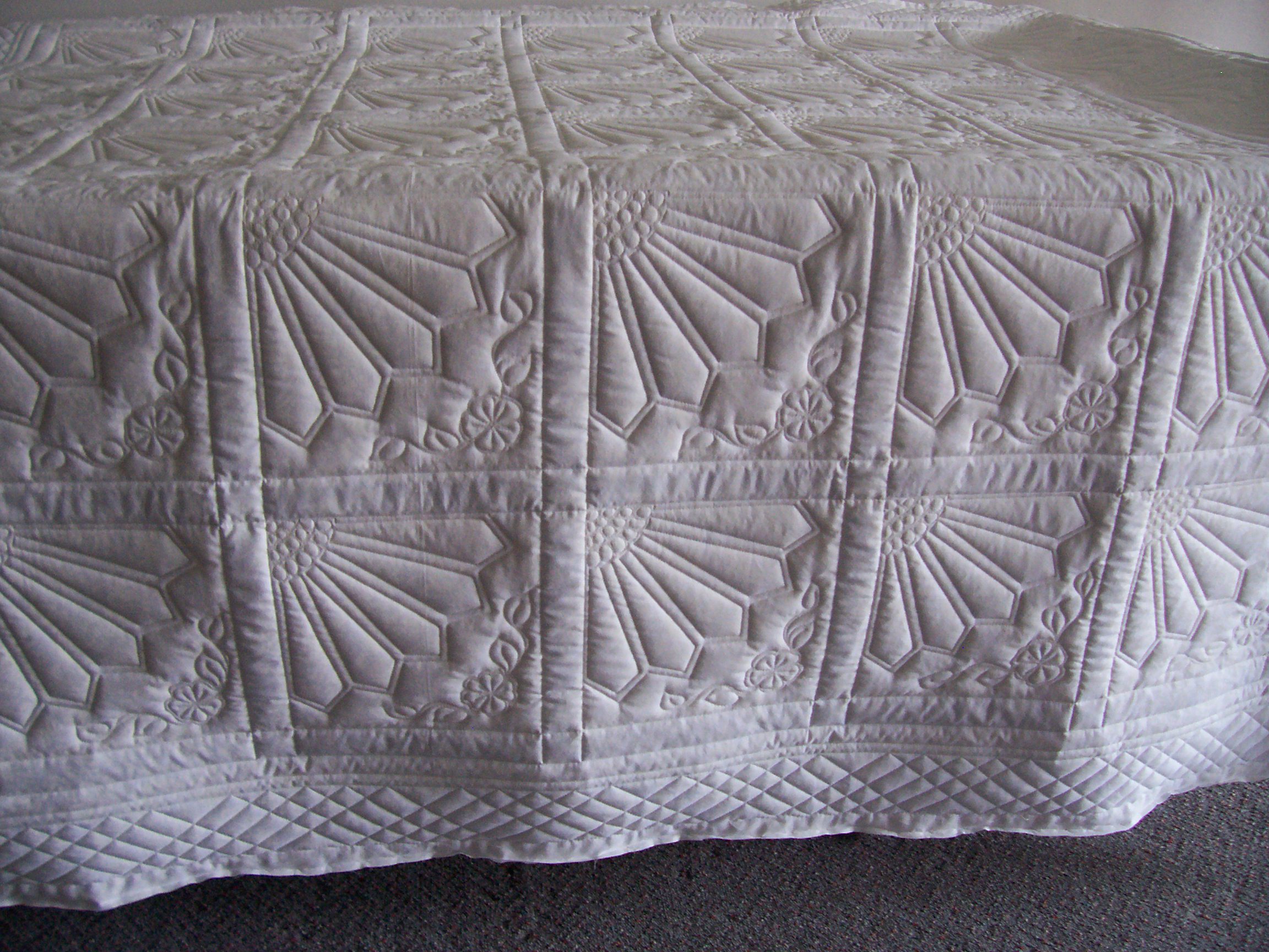 Talk about some beautiful piecing!! This Grandmother's Fan quilt is pieced in soft blues, greens and lavenders with a cream background. I used a ruler to quilt the SID, crosshatching and outline quilting. The flower vine are freehanded. You will notice the crosshatching in the border is modified just a little.