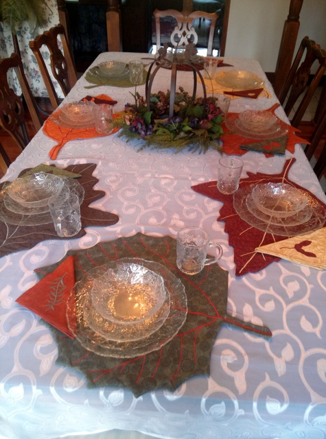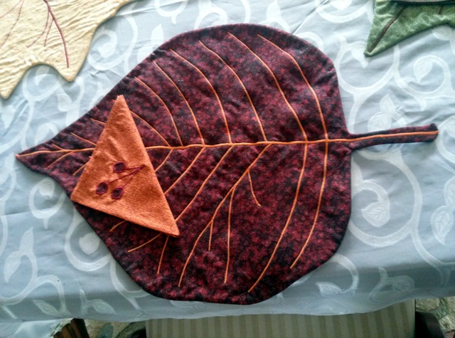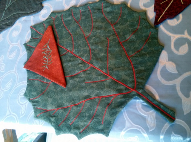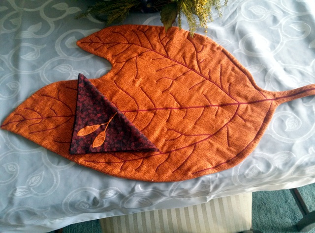 I made 4 leaf placemats for my gathering room table. Found a new fabric I just couldn't do without, but where to put it. Gathering room it is. So where would my leaf placemats go? Dining room, of course. Except, now I needed 4 more leaf placemats. Wanted them all different, but only had the original 4 leaf patterns. I took the original leaf patterns and made adjustments for the new leaf shapes.