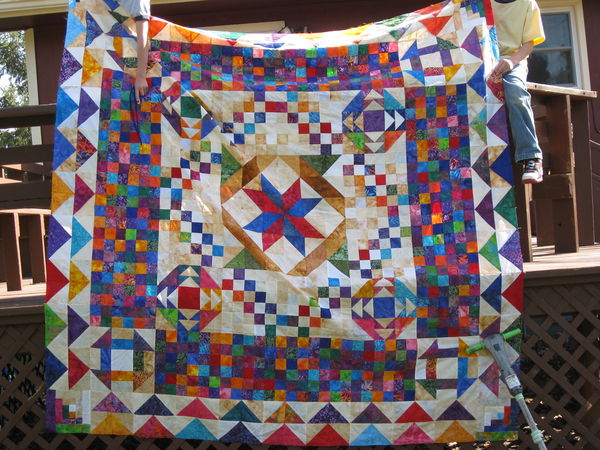 I made this quilt as a Mystery block of the month. It was an 8 month program. Every month I would get the 5 inch sqaures and the instructions. I didn't know the design, the only thing the LQS told me it was Batik fabrics.