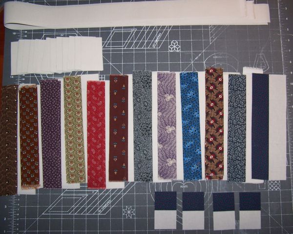 Going good so far today. Got the rest of the pieces in the pic sewn together and pressed, the other 24 CW pieces are sewn to the ivory and ready to cut into sections, and half of the small ivory pieces are cut.