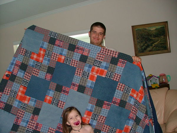 This was my latest project using denim - a rag quilt, approx 36x42, made from 8" squares of assorted denim, backed in flannel squares and then free motion quilted in each square.
