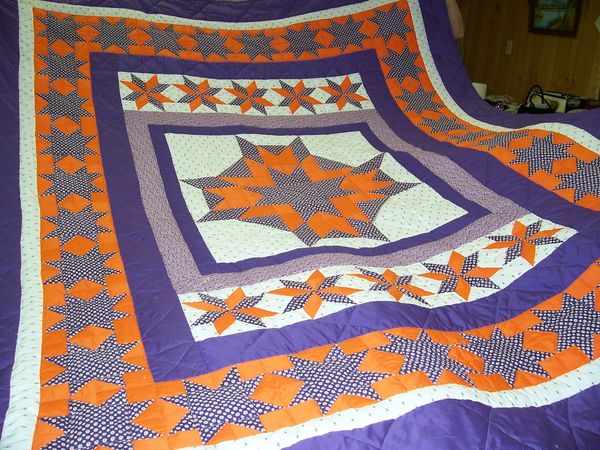 I can visualize a quilt done in shades of purple and shades of orange - but my guess is because your customer said only white if adding a third color that she may not be happy with anything except a solid purple and solid orange and solid white (if necessary). You could do a triple Irish Chain using white for the background, orange for the center of the chain and purple for the outsides. Concur with Cowpie2 that a pinwheel pattern would also work well, as would someone's earlier suggestion of a DNP. Guess what pattern you use will depend on how big she wants it, how soon she wants it, and how much time you want to spend on making it. Be interesting to see what you come up with.