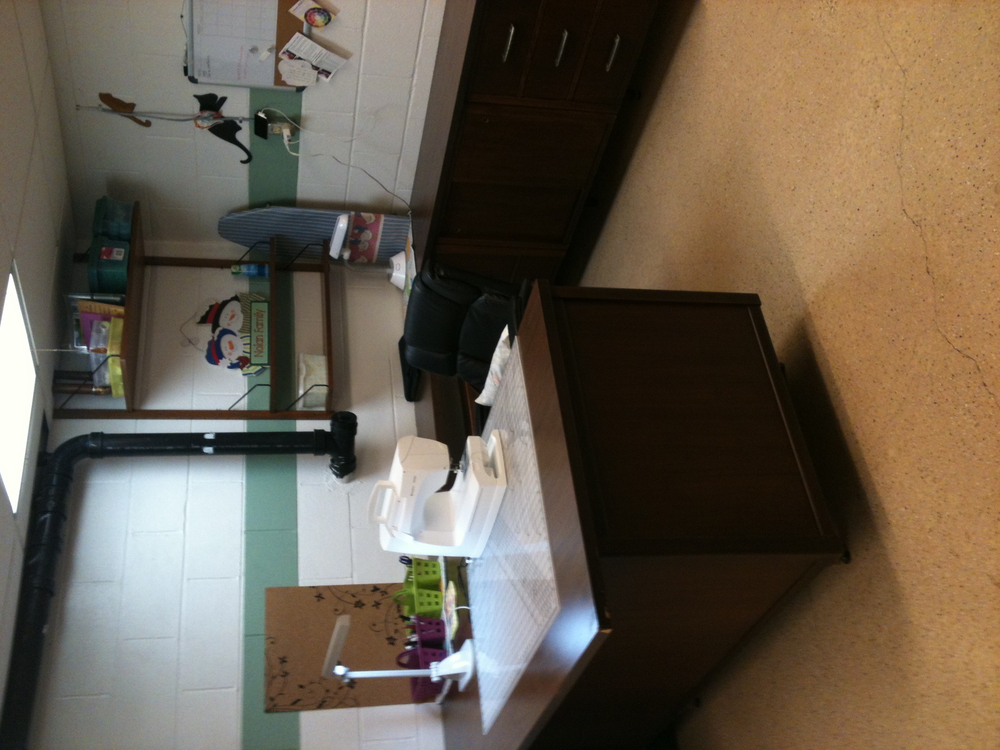 Hi all. My sewing room/ laundry room is in the basement. I love not having the mess upstairs. I can spread out and not be in anyone's way. My husband was at an auction this summer and they had a set of desks, credenzas and file cabinets from a local bank. He got them all for $25!! This is what he put together for me. I love all the useful surface space and storage. There is another credenza in the opposite wall too. My cutting table is also there too. We have a wood stove in the rec. room next door so being warm isn't a problem and it stays cool in the summer. Just perfect v