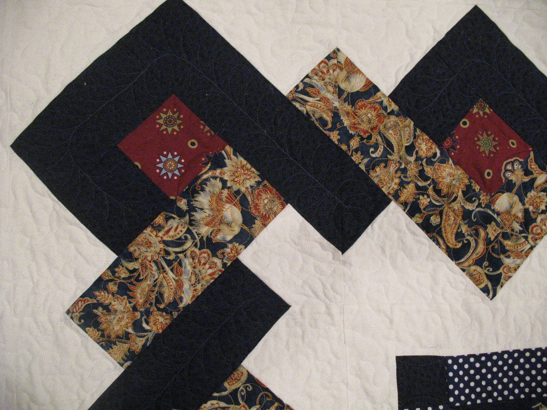 This is a 76" square throw I just completed. The colors are navy, red, and gold. Sorry I can't offer you a pattern; I made this from a magazine and I'm not sure if you could find the exact same one. But it was titled a French Twist. I was nervous about the outside blocks fitting once all the inside squares and counterpoint squares were finished, but it matched quite well, so the pattern maker knew what they were doing. I had fun quilting this freehand on my Bernina 440 with the BSR. I did lots of stippling on the white and feathers on the twist and the center blue blocks, and easier, larger patterns elsewhere. I matched the threads pretty closely to the materials because I didn't want to detract from the color combination and the richness of the contrast. Thanks for looking!