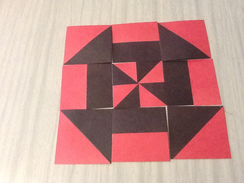 We have a tutorial on QB for Disappearing Pinwheels but I was over on Roolens site and noticed she took it a bit farther. By making all the cut units measure even, she could change the arrangements of the cut pieces in interesting designs. I had to try it and just used construction paper. Let's see if I can post these.