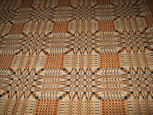 I have two of them. They were typically made of linen and wool (linsey-woolsy). The looms were relatively narrow so you will often see a seam down the middle where two strips were attached. Somewhere I have a book about them, but I can't put my finger on it right now. The different patterns have names and I meant to look up your pattern. If I find the book, I'll let you know.
