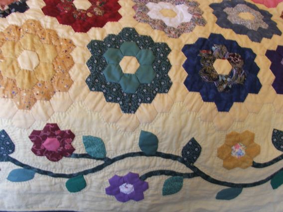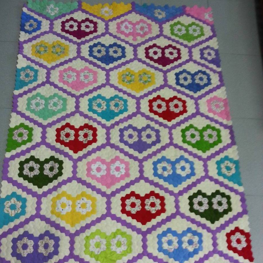 Thought I'd better show some of mine, LOL I am using the squares, stitching around the back, attach to each other, along the sides, then I go back and trim any that are enclosed by others. All my flowers will have the same yellow center, I have lots of it! I am using the plastic templates by Brandy's and her method of sewing the hexies together side by side, not front to front. http://www.brandysquiltpatterns.com/