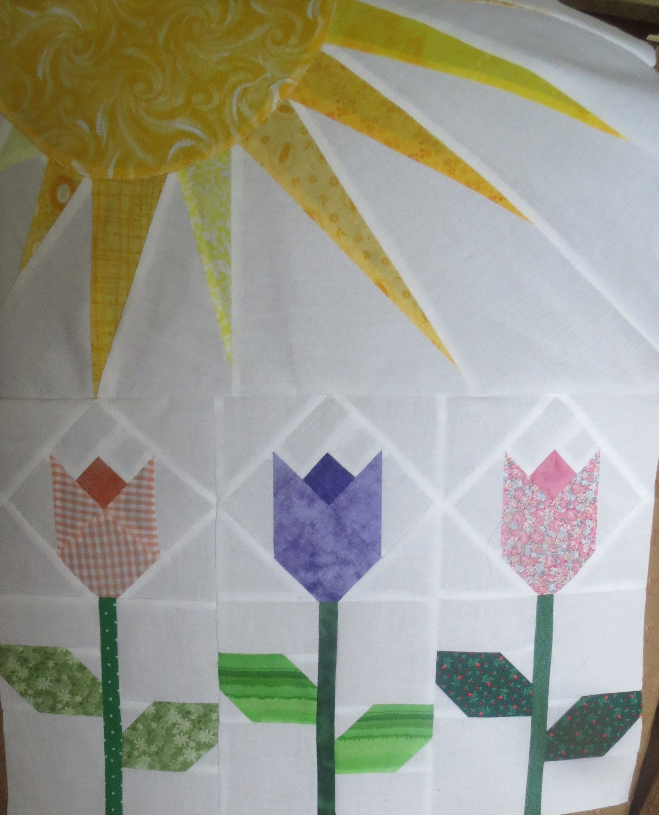 What darling fabric you used to make this checkerboard quilt with tulips so bright and cheerful.