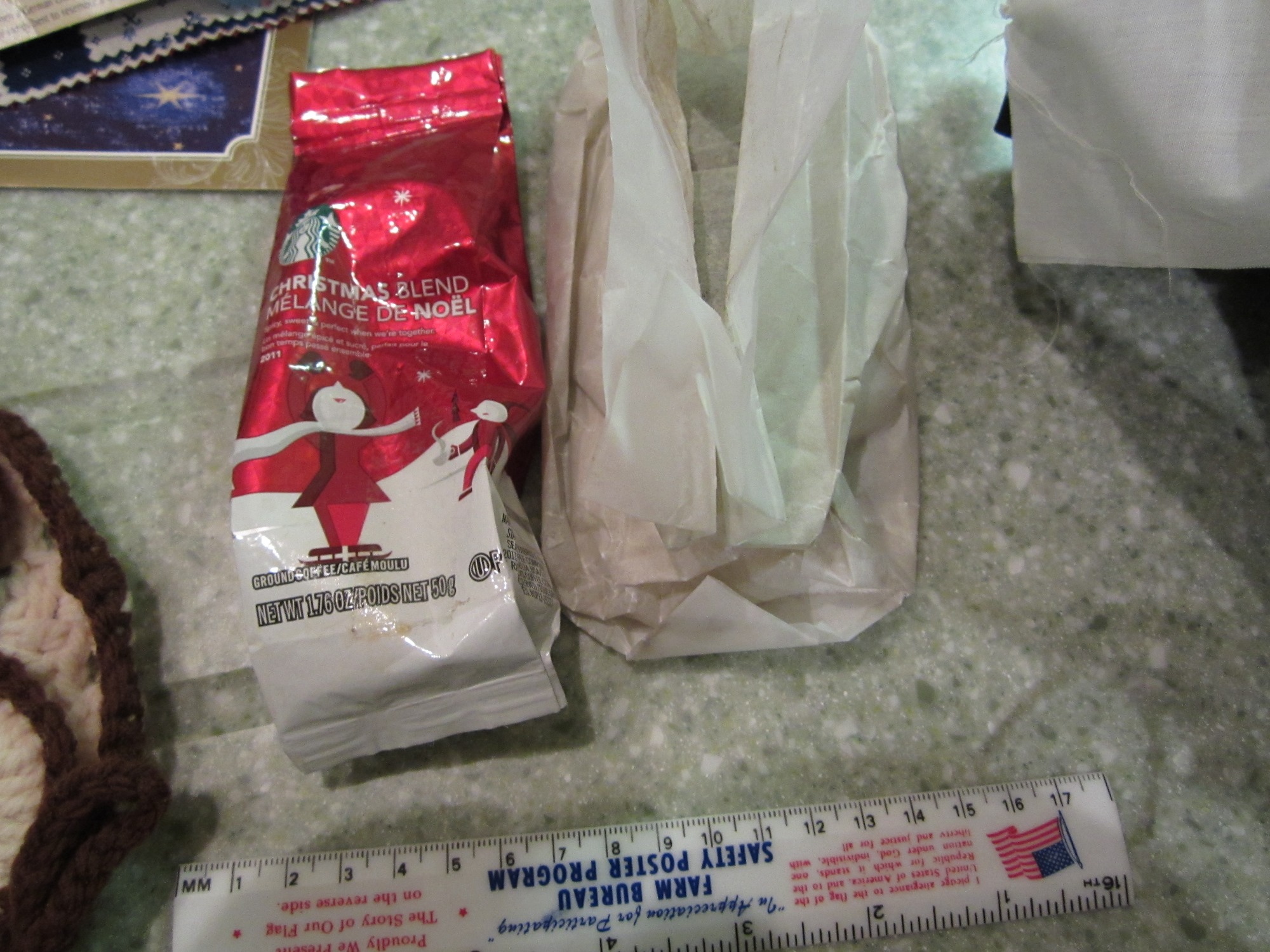 If anyone receives a package such as this, you need to let me know! This is what I call trash and I'm sure others will agree. It's one thing to repurpose items, but this is not repurposing, this is trash. The only thing that I can see that would be appropriate is the coffee since it's unopened. But no one wants "treasures" such as this.