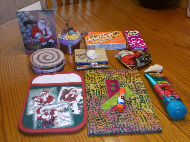 I received the most wonderful Santa package from Cuppy. She sent a beautiful heart Santa ornament for my collection, a neat pin cushion made in a measuring cup, honey bun roll which I can definitely use, 4 fat quarters, good smelling body lotion, 2 Christmas potholders, glue stick, a notebook covered with batik fabric (love batik) and some of my favorite candy. Thank you so much Carolyn. I love everything!