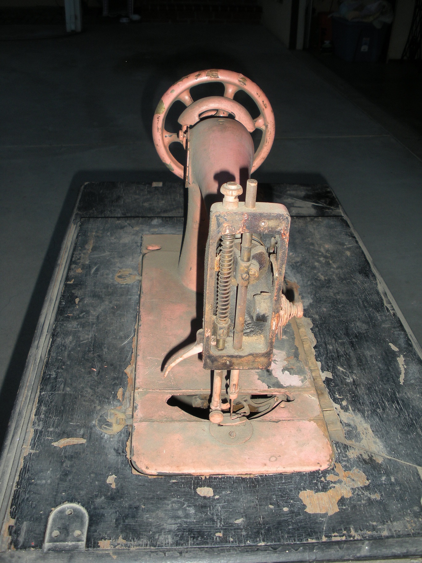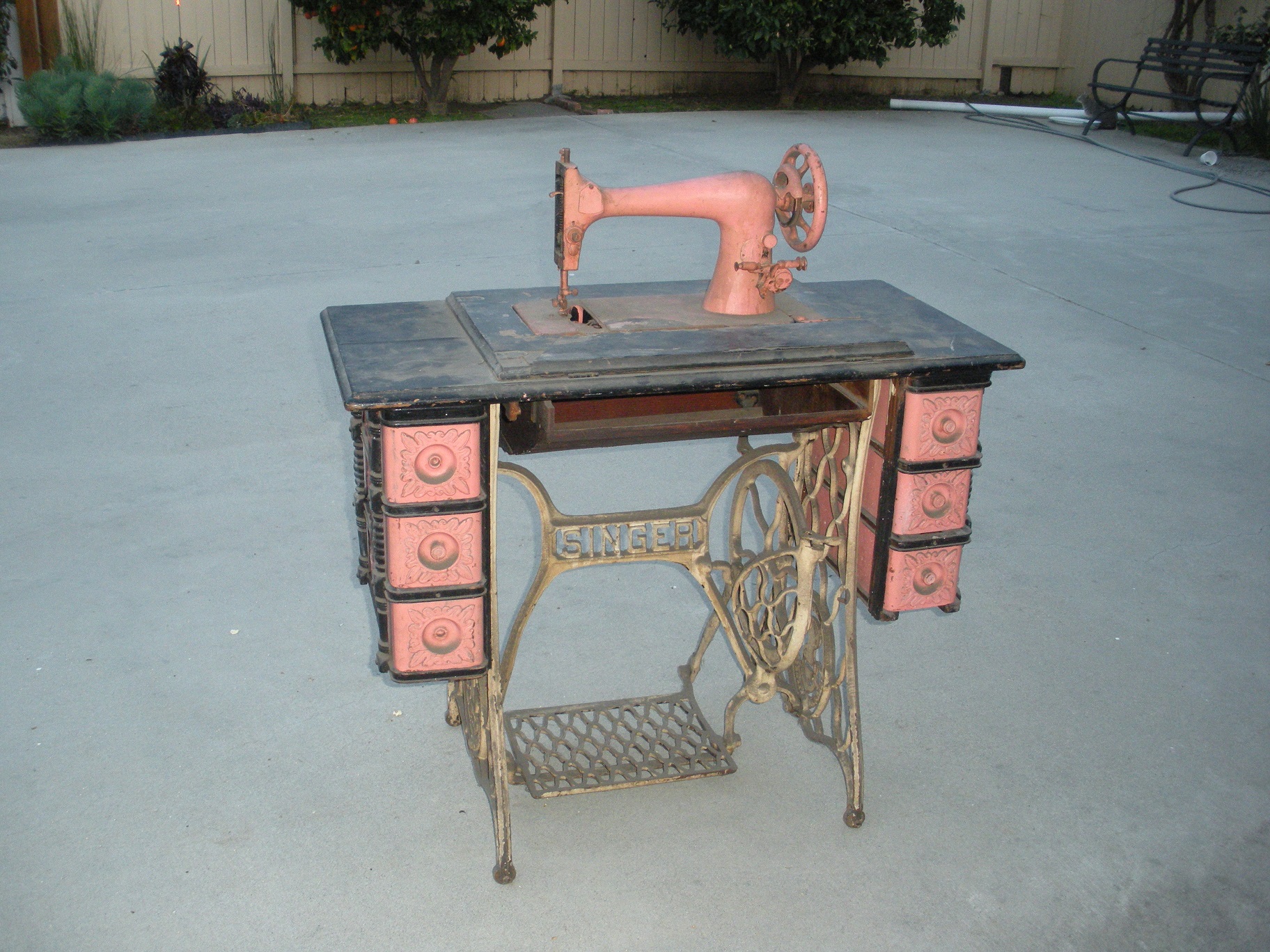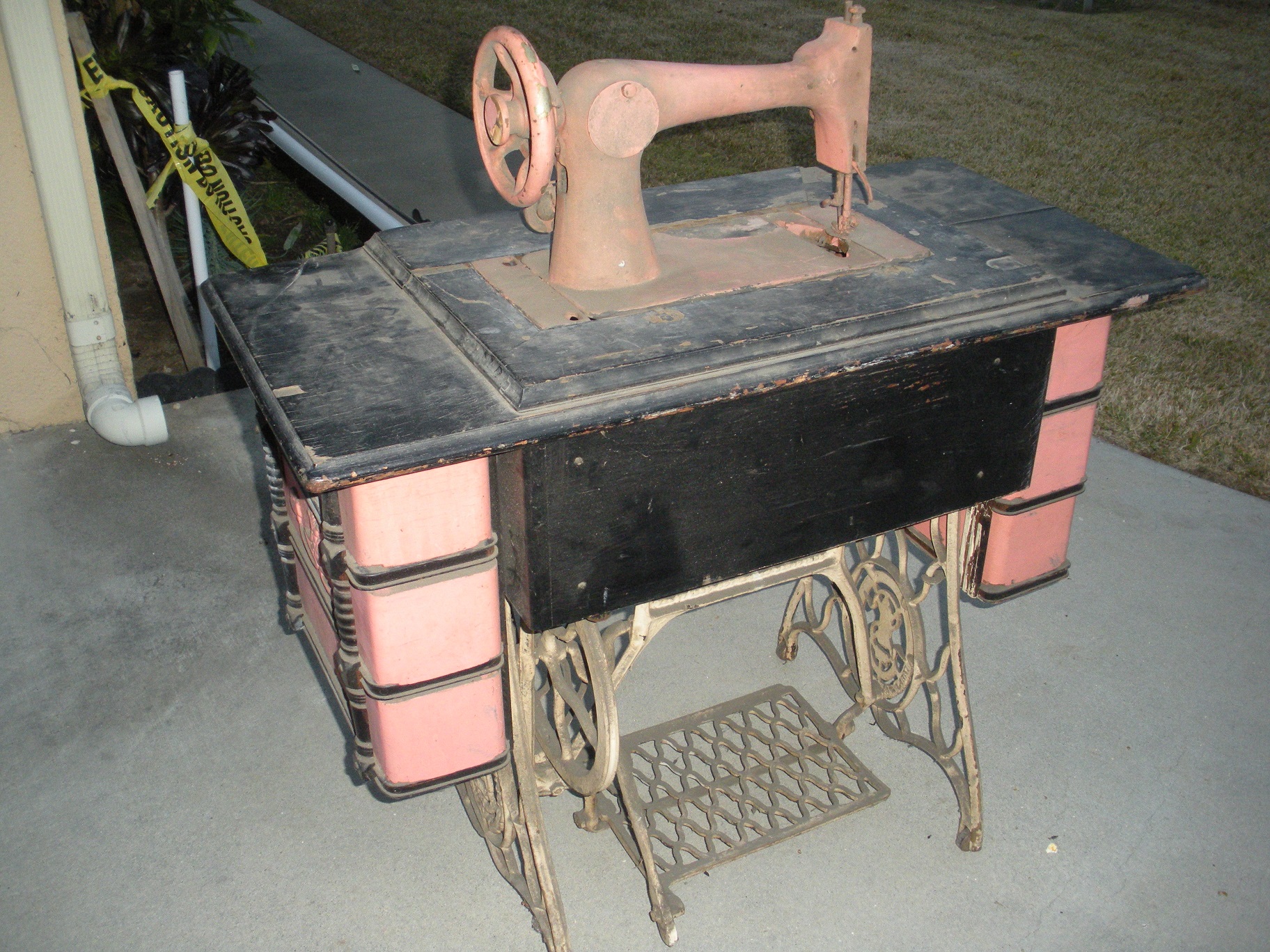 This treadle was given to me by a neighbor. I cannot find the Singer date chart to find the date of manufacture or model number. The serial number is K282568. Can anyone help me identify and date this machine? The challenge is do I start with paint stripper or a sledge hammer. The up side is that the irons are in good shape. Can you believe that someone did this to a Singer treadle machine?