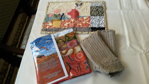 That's a lovely mug rug you received, Lizzie! And Aboriginal fabric -- wow; how special is that! The other goodies are nice, too -- I wonder if Debbie knitted those mitts? Very nice package!