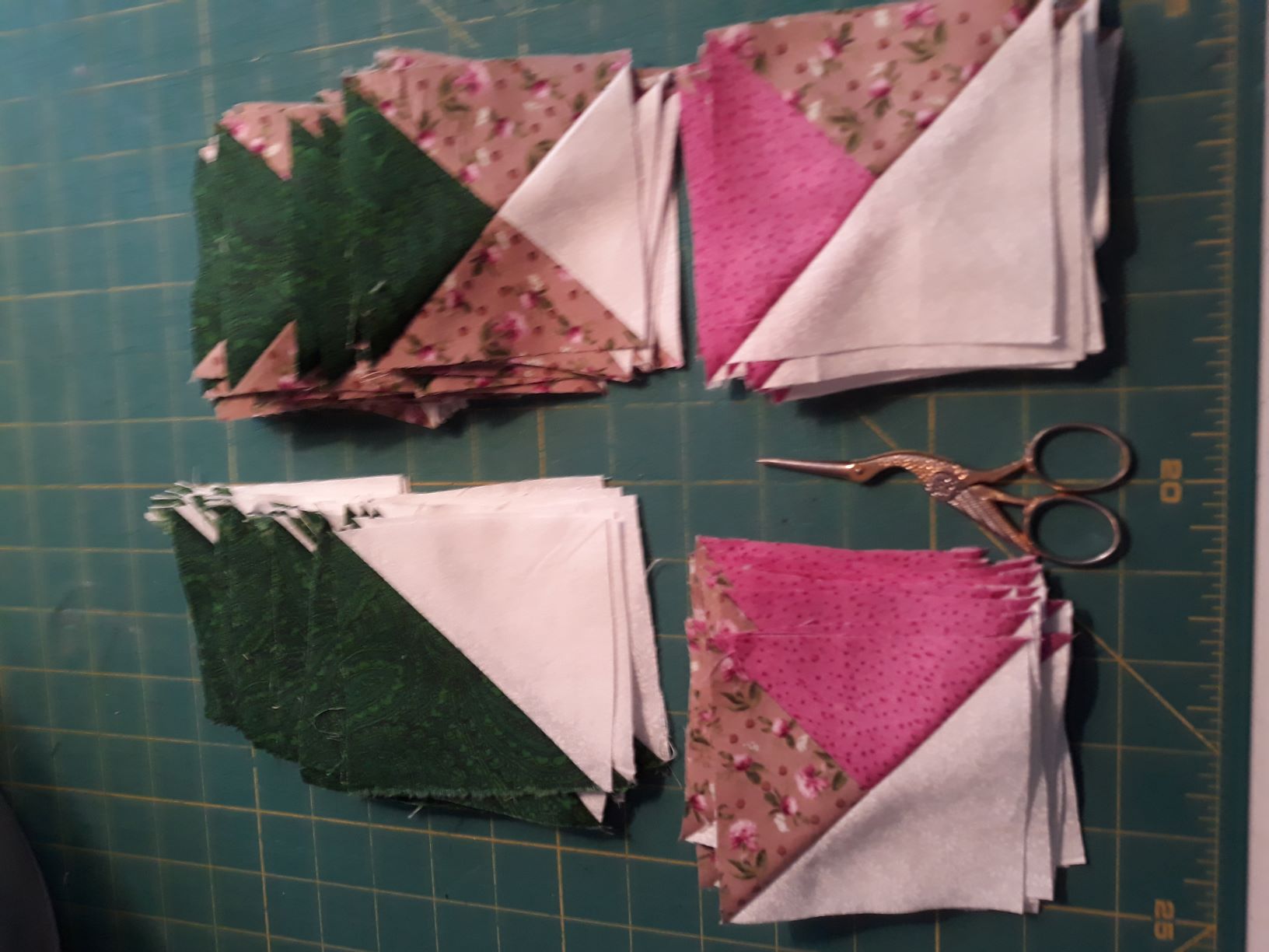 This week we’re doing what Deb Tucker calls combination units. Again, some people have different names for this, including quarter-square triangles. It’s a good thing we can post pictures, right? They will be made with cream (#1), gold (#2), and turquoise (#3.) The directions for this are very similar to last week’s units.