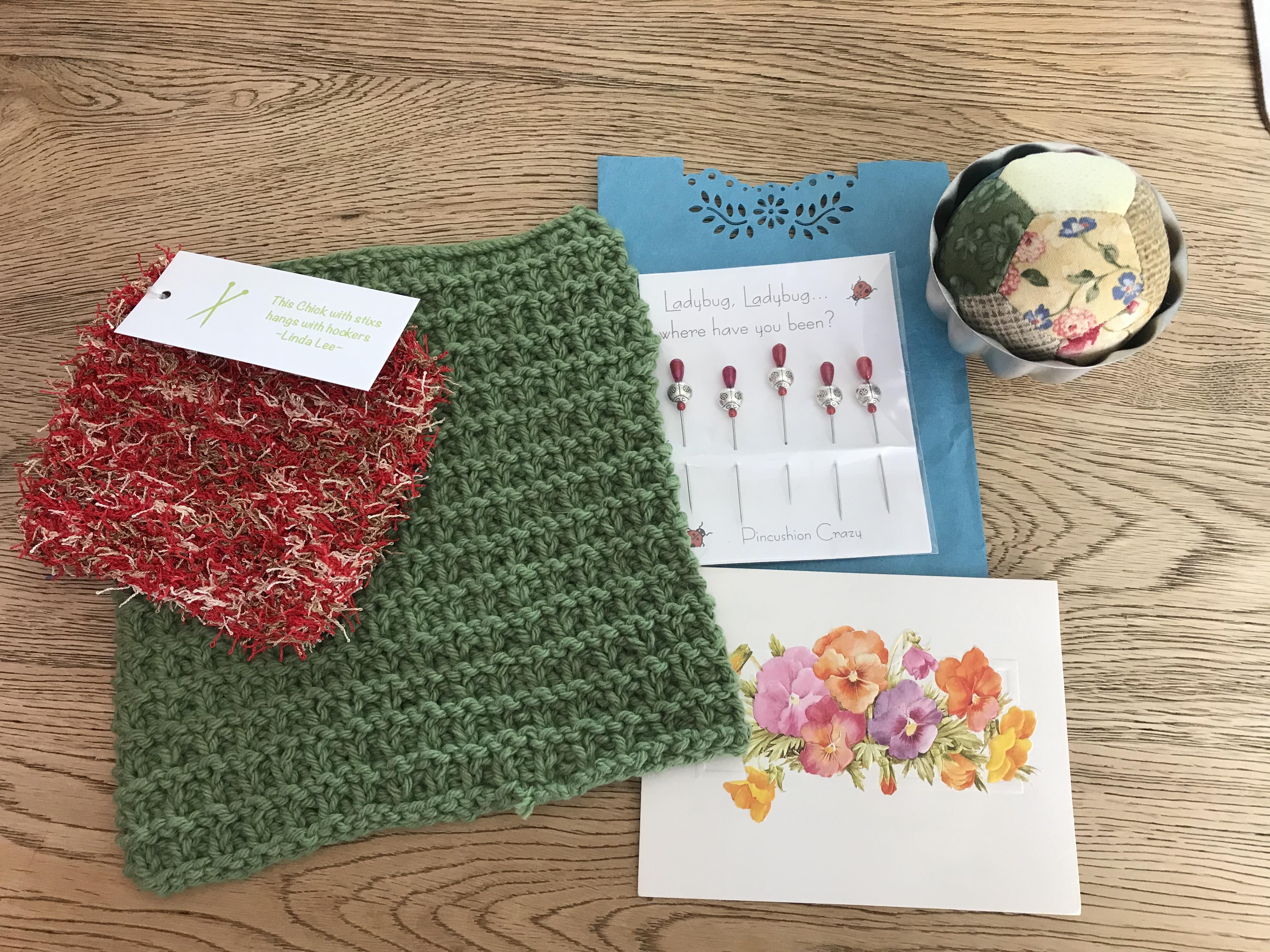 She made a fantastic ball (from Hexagons) that sits in a fab Jell-O tin. It is just such fun! And check out the goodies that she sent... lovely pins (that we just cannot easily get over here) and she made me a scrubber and dishcloth. I have to say the label that is attached to the scrubber and cloth did make me laugh.... hopefully you will all be able to enlarge the picture and read it!