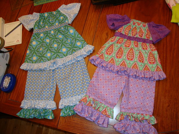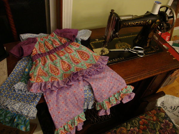 My daughter has two adorable little nieces. I saw a pattern for these outfits and just loved it for Spring outfits for the two little girls. One is a 3T and one's a 2T... The pattern is McCalls 6062. I did most of the sewing on my 1908 Singer 66 treadle (in my avatar), including all the ruffles done with the ruffler attachment that came with the machine. It made the most beautiful ruffles in no time!
