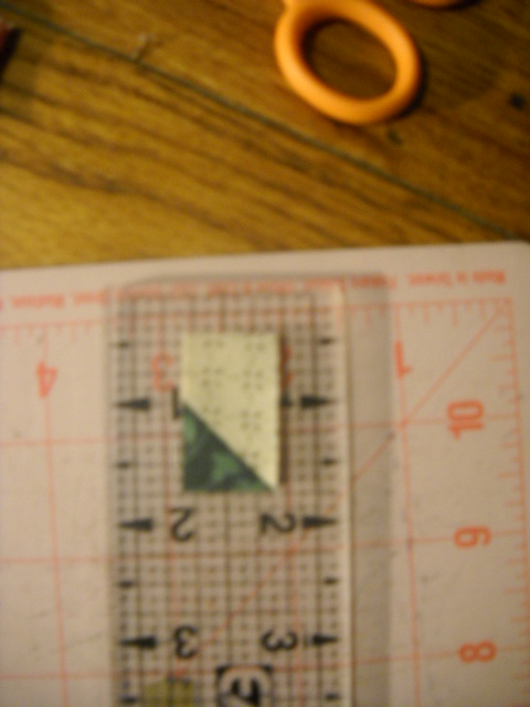 This first one I used a 1 1/4" HST and I cut it to 3/4". I only cut one side so you end up with a piece that is 1 1/4" long by 3/4" wide. You can use a 1" HST with out any cutting or you can cut down a 1 1/2" HST to a 1" to make your BPS. It is up to you what size you want to aim for. Just remember you only cut the one side so it is not so small to handle. You will trim it down later.