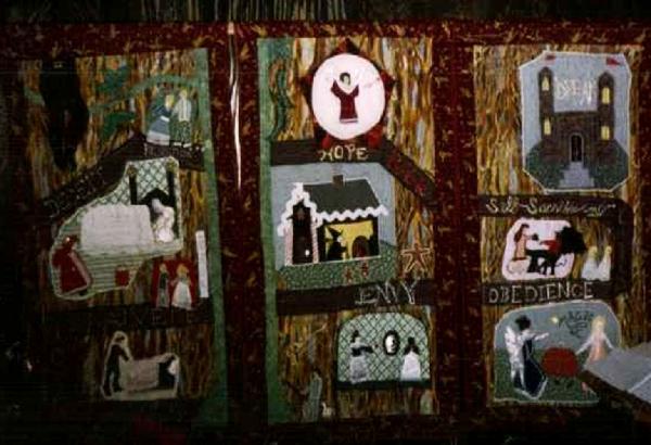 Here are a couple of story projects I've done as commissions. The tryptych is for a therapist's office - themes people bring to her office and fairy tales that match. The nun's ghost quilt is a room divider where I was given a challenge to match Holstein cows and Southwest decor. You can't tell from the pic, but bottom is trapunto.