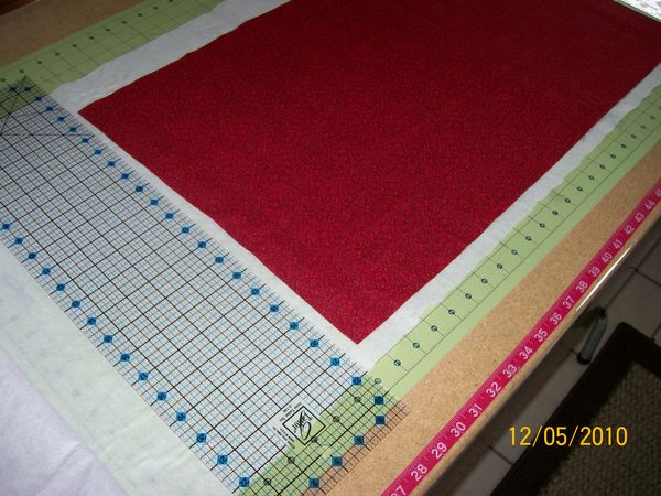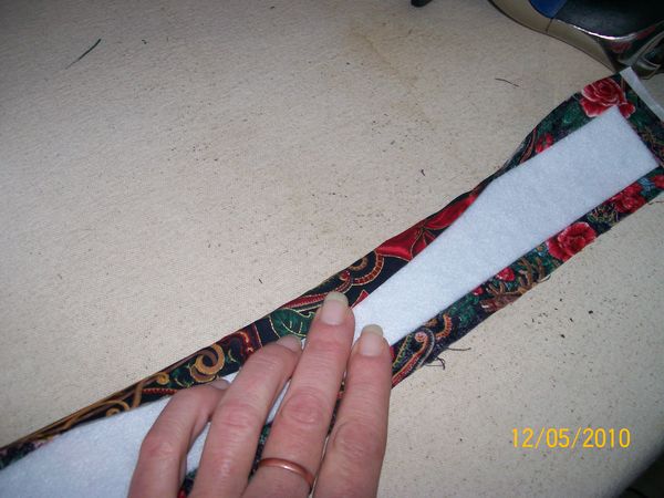 Take your 3x25 inch fabric and lay them wrong side up on ironing board, lay your fusible pellon971 in the middle rough side up and press like so....careful this can get quite tricky. Be careful not to get the iron on the pellon it will stick to your iron. You could use a pressing cloth or teflon sheet, I just prefer not to. Repeat for all four strips