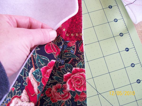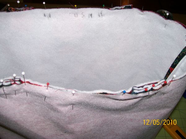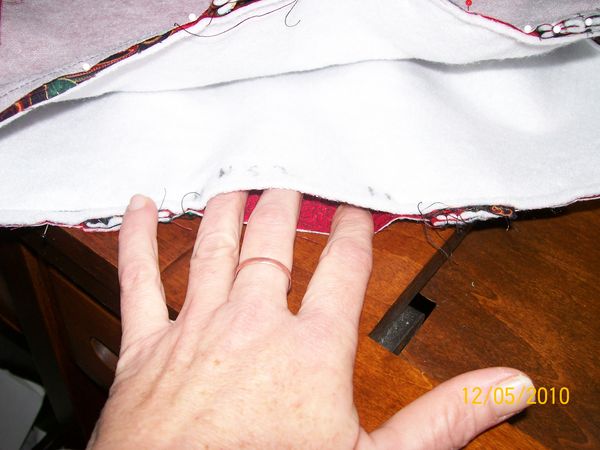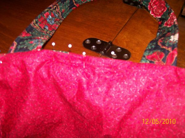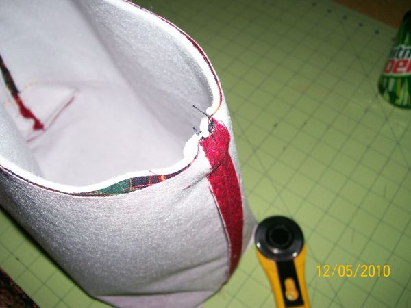 Sew around the top using your 3/8 or 5/8 seam allowance, leave a hole, I start at the edge of the handle, Dont leave it to small about 4 inches should do.
