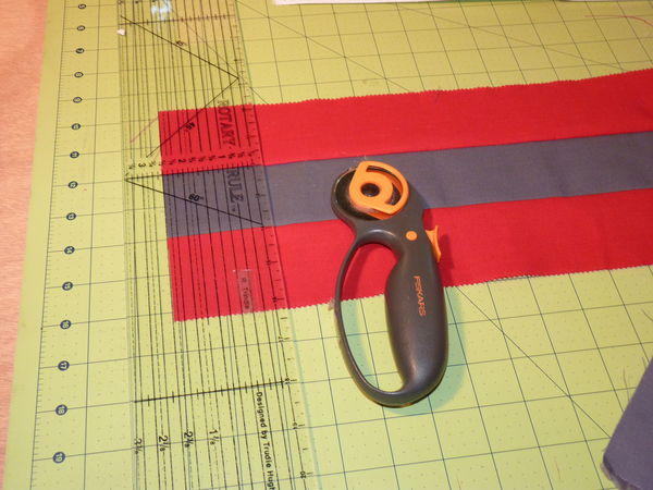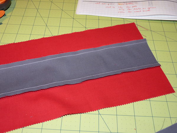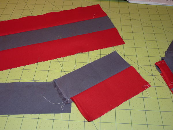 I was using strips of fabric from a Moda jelly roll of red, and yardage of grey. The jelly roll is 2.5 inches by width of fabric. I cut several strips of gray to the same size. I also cut some grey yardage to a 6.5 inch strip. Because I only had red jelly roll, I didn't have the option of cutting wide strips of red.