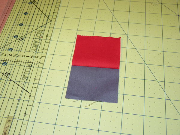 Now take your pressed strips to the cutting board, neaten the end, then with the length of fabric to your right if you are right handed, use your rule to measure off the desired sub-cut. Note that I lined up the perpendicular line of the ruler with the seam between the two fabric strips. Cut your sub-units. The assemble the sub-units in your pattern, and stitch them together.