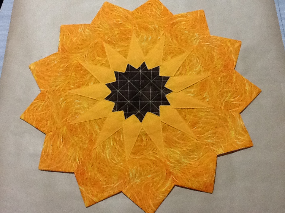 Here is the center stitched in. I put a piece of quilt batt under the brown when I pre quilted the circle and it made it a bit bulky in the middle. If I had to do it again, I would leave the batt off.[ATTACH=CONFIG]555014[/ATTACH]
