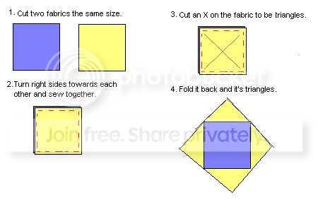 The tutorial showed a picture where (I thought) you cut two squares of the same size, one for your center on point square and one for the triangles. You turn them so the right sides are facing each other, then sew them together, like so. (Here's hoping I do this right.) <img src="http://i396.photobucket.com/albums/p...eTutorialQ.jpg" border="0" alt="quilting tutorial"> Sorry, I had to make a picture in Windows Paint, since I can't find my camera. Paint has its limitations; when unfolded, those triangles are neat and make a square of their own. Problem is, it includes their seam allowance. Once I sew that to the rectangles (the blue pieces in my avatar pic), it cuts off the tips of the center square. Anyone know where that tutorial is, so I can take another look? |