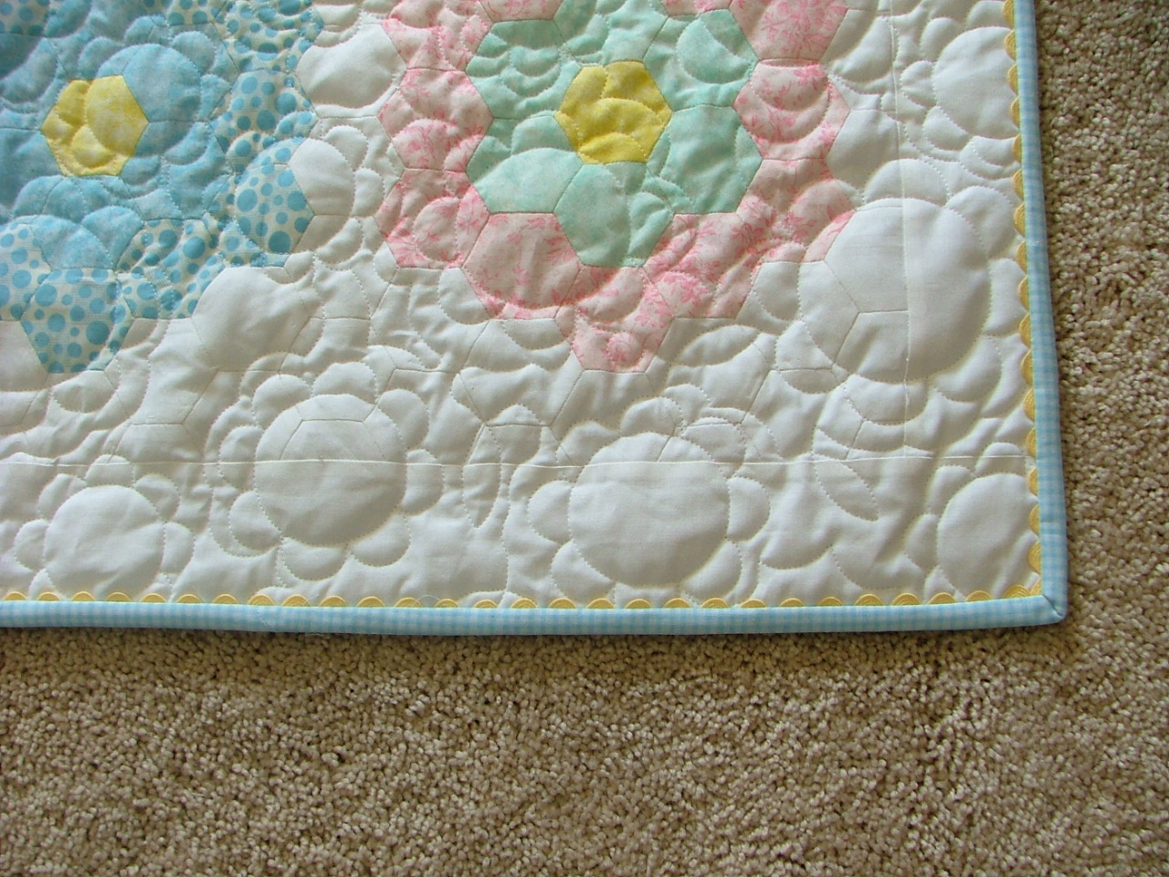 Awe, this is so soft and sweet looking, I love,love,love hexies! Love the way you put the ric-rac on with the binding, too cute!