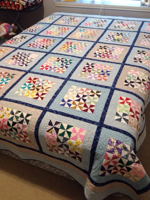 My leaders and enders for just about all projects are little 3" pinwheels. I put them into a nine patch and set them aside. So, when I needed a quilt in a relative hurry I pulled thirty (which is all I had) and put them in a simple setting with more scraps.