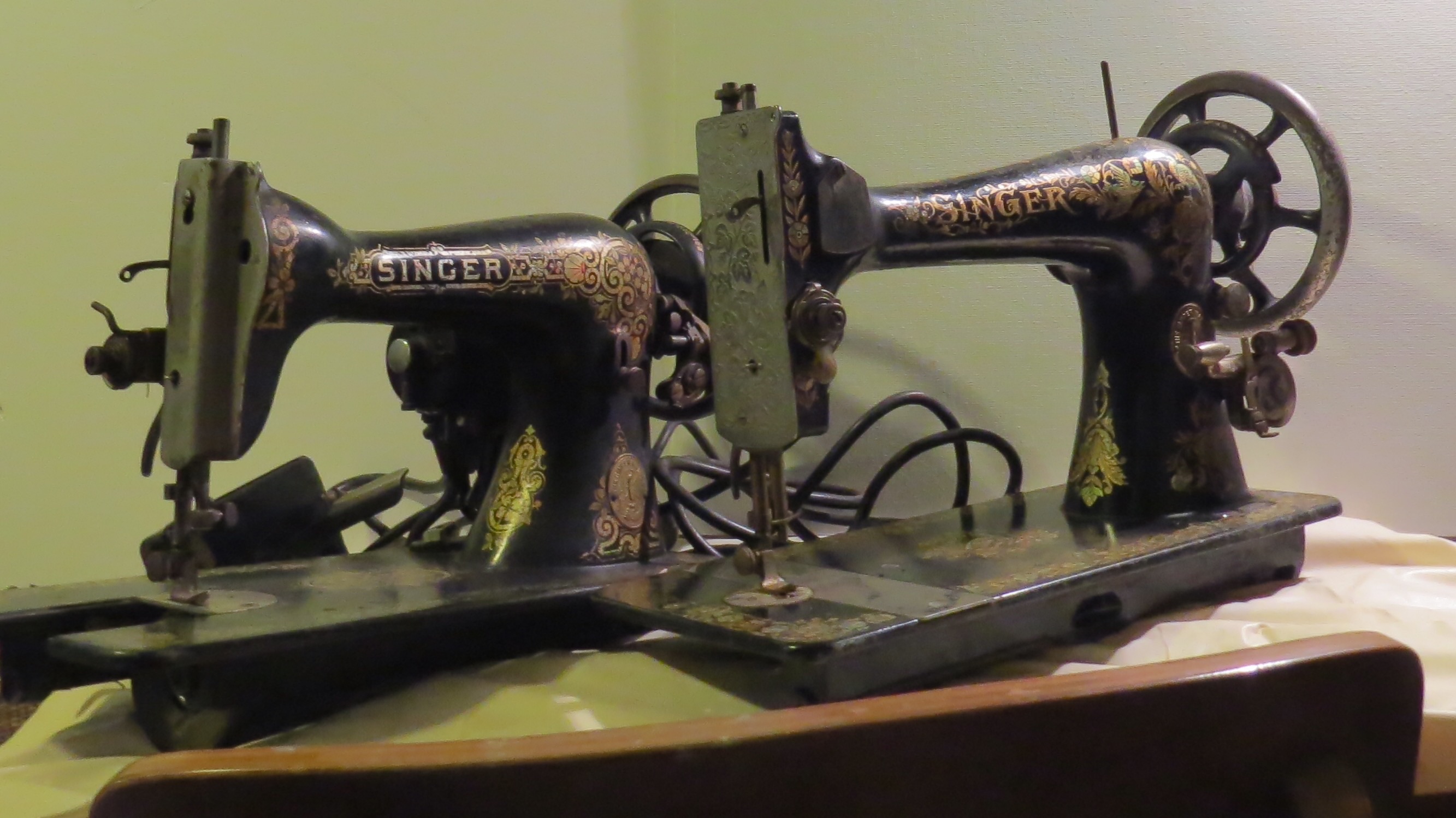 Here's a picture of the two after a little cleanup. They look better now. I forgot to mention that someone had added a motor to the 15-30 by drilling two small holes through the bed. We took it off, but it's actually kind of an interesting Franklin motor with a vertical foot pedal.